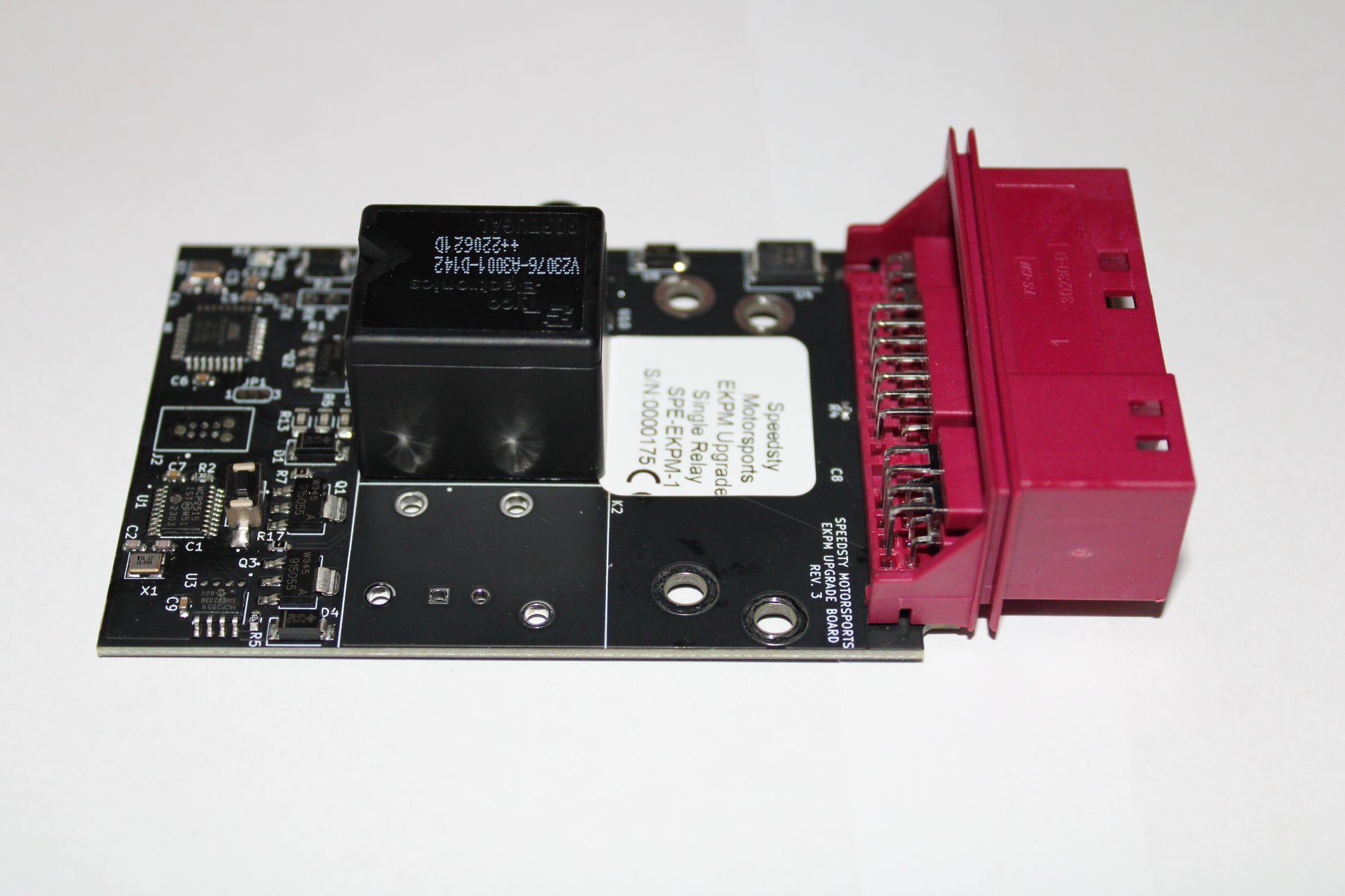 The EKPM replacement board uses relays to directly control up to two fuel pumps. It has canbus support to emulate the stock EKPM and is capable of up to 25 amps per built-in pump. This board uses high-quality 45 amp relays from TE connectivity, and a grounded output that is configurable based on your pedal position, engine torque, fuel flow rate and is triggerable by a custom canbus message.